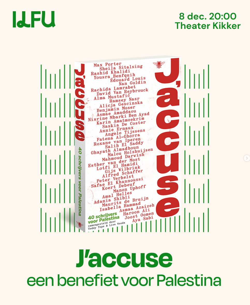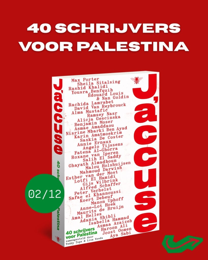 Op 2 december ligt J’accuse in de boekhandels. Veertig Nederlandse, Vlaamse én internationale schrijvers spreken zich in dit boek uit tegen het uitwissen van de Palestijnen. Omdat stil blijven geen optie is. Omdat woorden, ondanks alles, het enige zijn waarmee we kunnen duiden, bewaren, aanklagen en tot actie bewegen. Deze bundel is een daad van verzet, een publieke aanklacht, een collectieve stem. In de traditie van schrijvers als Émile Zola die onrecht publiek maakten, spreken ook deze hedendaagse auteurs zich uit met poëzie, literaire vuistslagen, woede, actie en ook hoop. J’accuse bevat bijdragen van onder andere Haroon Ali, Koert Debeuf, Mahmoud Darwish, Annie Ernaux, Nan Goldin, Safae el Khannoussi, Édouard Louis, Nisrine Mbarki, Ramsey Nasr, Max Porter, David Van Reybrouck, Aya Sabi en Peter Verhelst. Lisa Weeda en Teddy Tops stelden het boek samen, De Bezige Bij geeft uit.